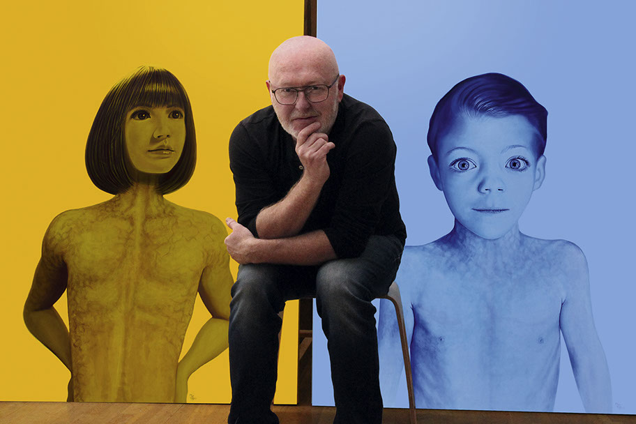 Die Online Galeristin Christina Labonté-Steinmann von Crelala Kunst über Edam & Ava: „Kinder, wie optimierte Wesen einer neuen Welt. Nackt, das Adergeflecht der Zellverbände gut sichtbar, durchschimmernd unter zartseidiger Haut, wie in Erwartung einer Untersuchung, wäre die Farbgebung nicht monochrom gelb bei dem Mädchen und monochrom blau bei dem Jungen. Kinder des Morgen denkt man, und ist versucht Fragen zu stellen, die besser ungefragt bleiben.“